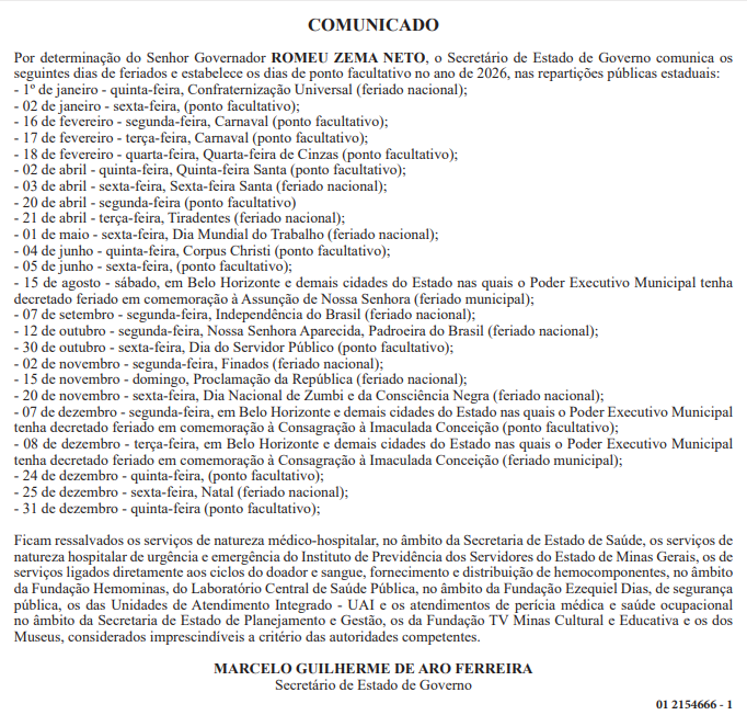 O Governo de Minas Gerais divulgou, por meio de comunicado oficial, o calendário de feriados e pontos facultativos que serão observados pelas repartições públicas estaduais ao longo do ano de 2026.